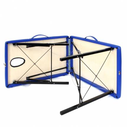 Раскладной массажный стол с прорезью для лица. Его прочная и лёгкая конструкция построена на базе каркаса из дерева и системы тросов. Для снижения веса ножки стола выполнены из легкого алюминиевого сплава.